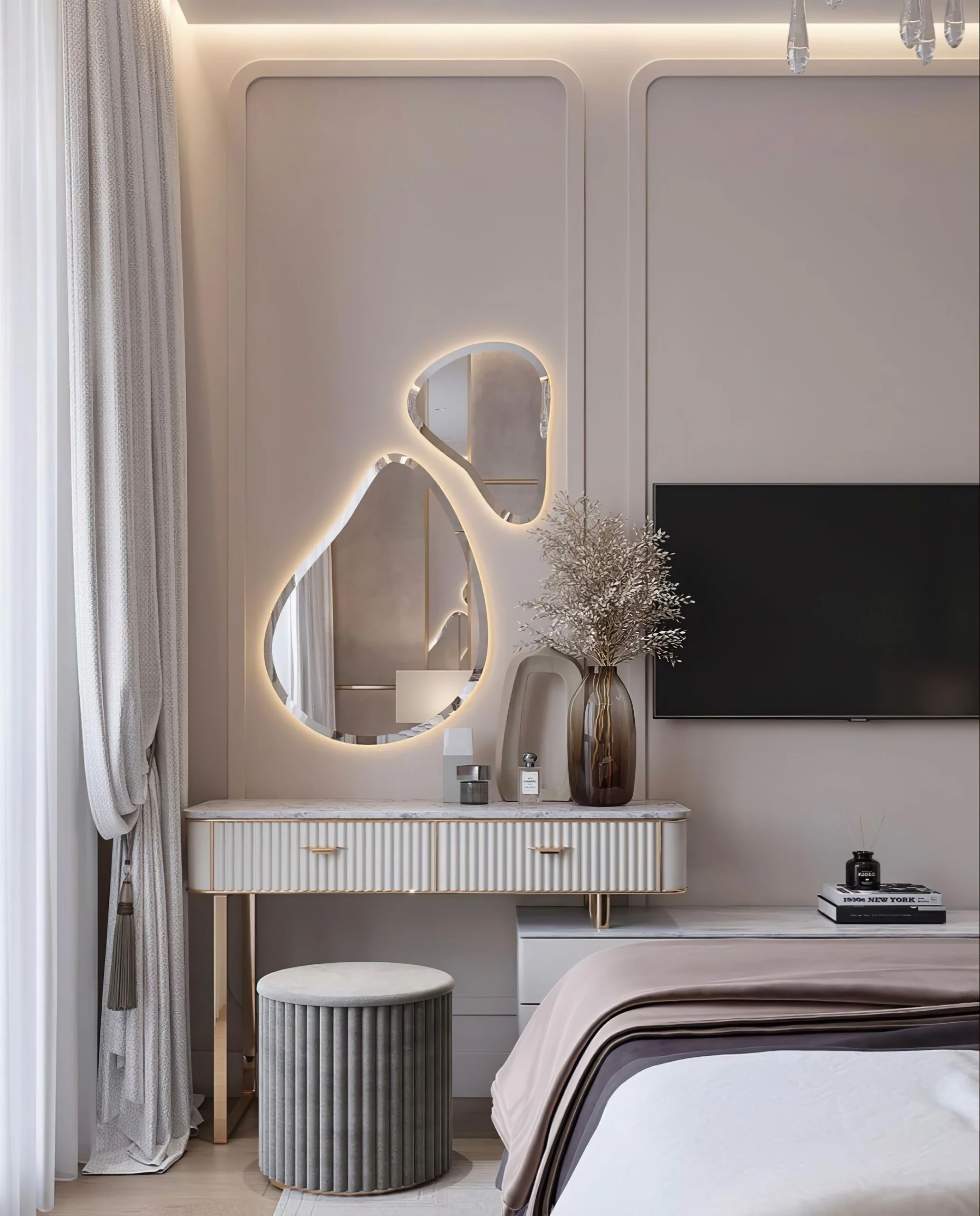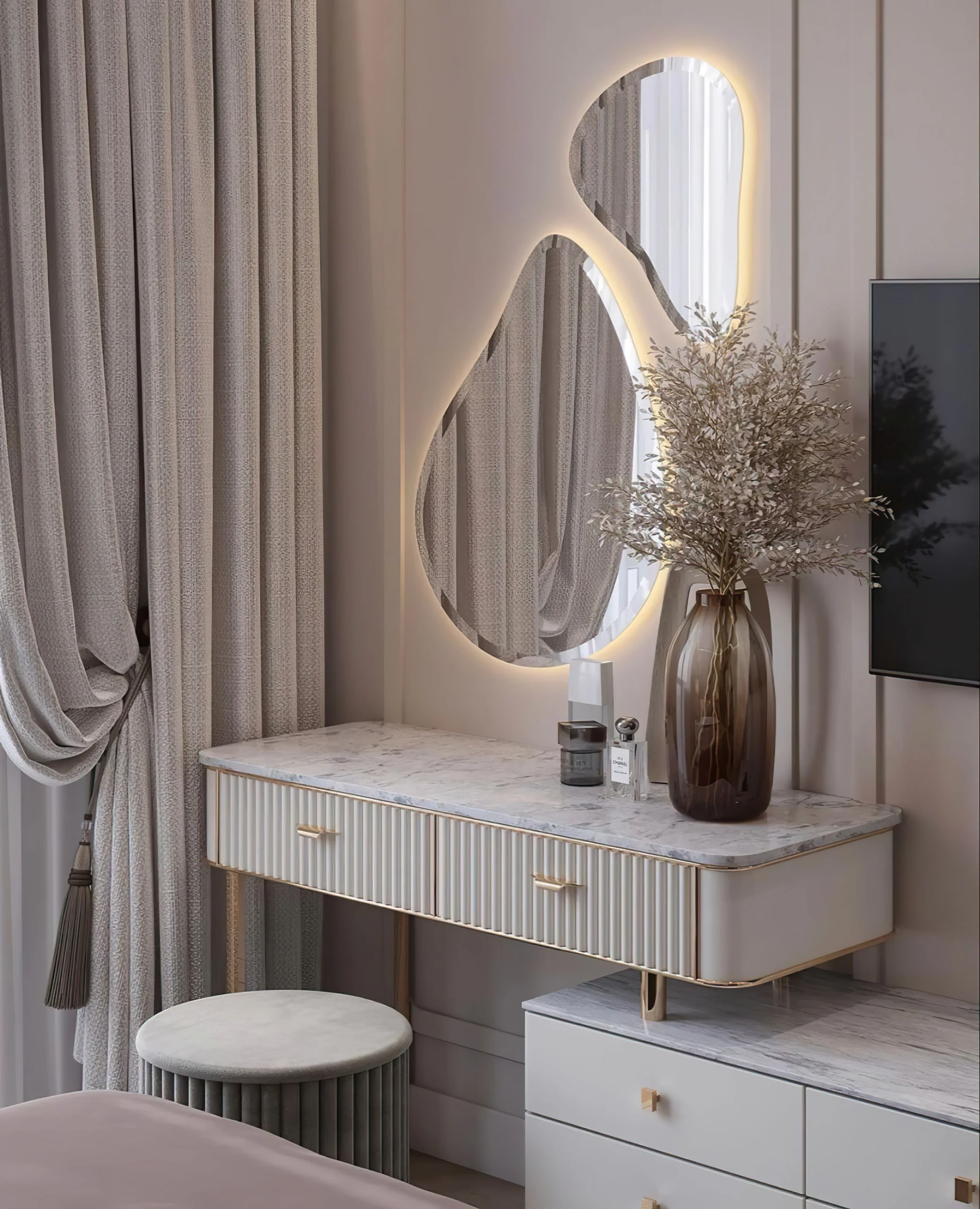 The asymmetrical LED backlit mirror creates a soft ambient glow, adding a touch of charm while making your daily routine effortless. A spacious marble-finished top offers room for your essentials, while multiple drawers provide organized storage for cosmetics, accessories, and personal items.