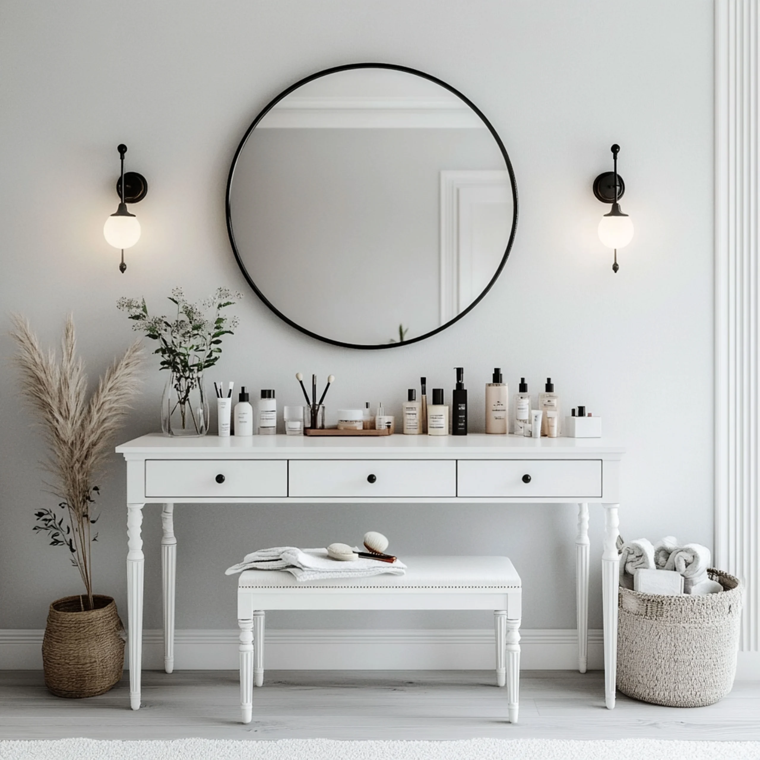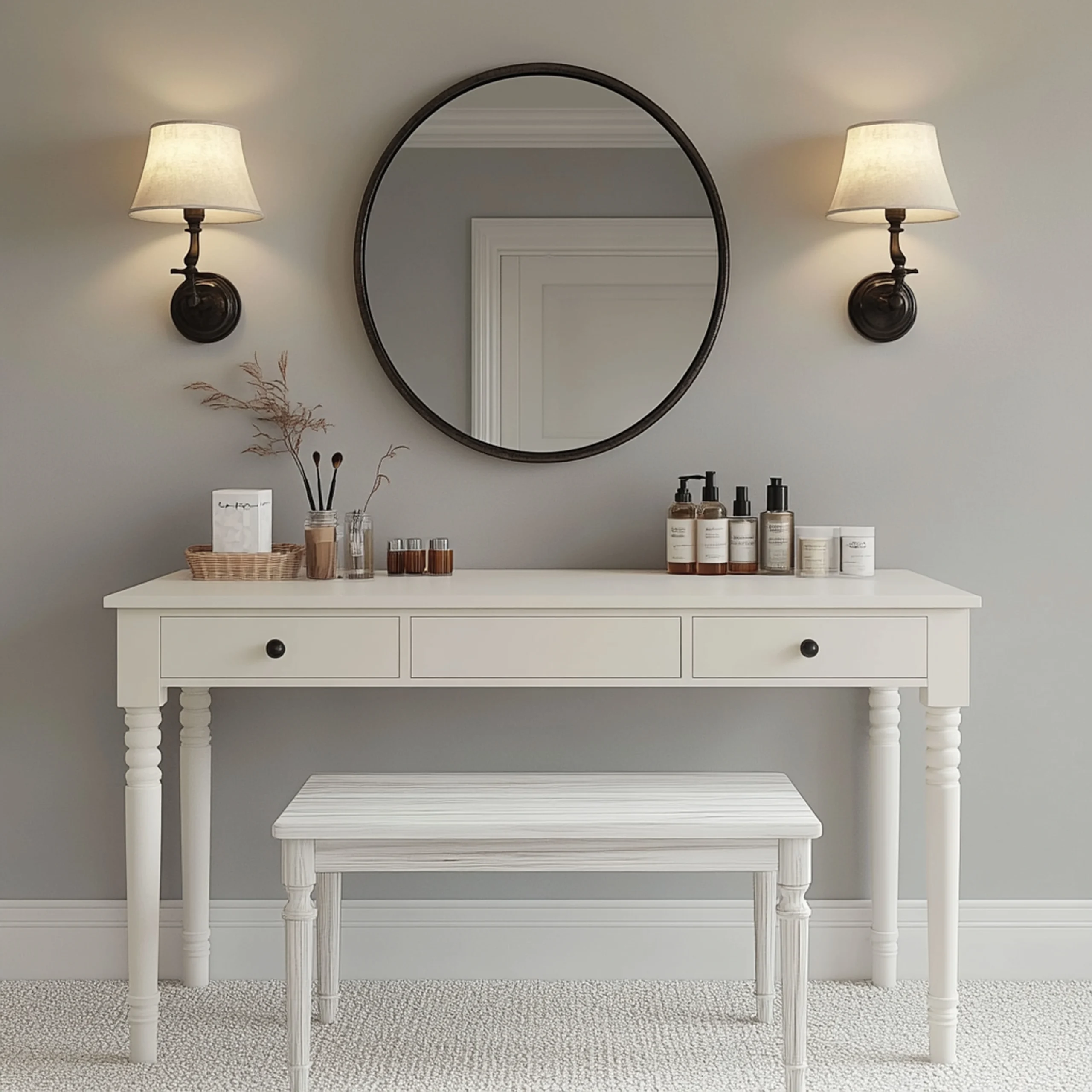 The spacious tabletop offers ample room for daily essentials, while three smooth-glide drawers provide organized storage for makeup, skincare, or accessories. A round wall-mounted mirror enhances the look, creating a bright and inviting vanity corner. The set is completed with a sturdy matching bench for comfort and convenience.